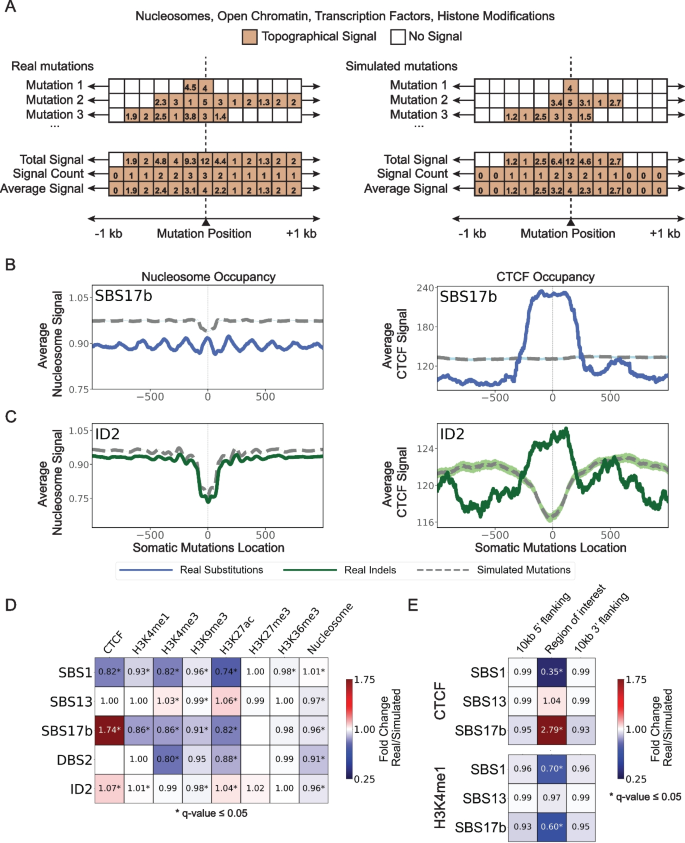 实验目的是评估突变特征在拓扑特征附近的分布模式,明确其与染色质结构、转录因子结合的关联。方法细节:以±1kb突变侧翼区域为分析窗口,整合微球菌核酸酶测序(MNase-seq)、染色质免疫沉淀测序(ChIP-seq)等拓扑数据,计算真实与模拟突变在侧翼区域的平均信号强度,通过统计检验对比两者的富集/缺失模式;同时支持全基因组与局部区域两种零假设模型,优化统计检验的准确性。结果解读:对552例食管鳞癌(n=552)队列的分析显示,单碱基替换特征SBS17b突变在核小体区域表现出约190碱基对的周期性分布,与核小体位置的损伤修复差异相关,且在CTCF结合位点显著富集(q值≤0.05);插入缺失特征ID2突变在核小体占据区域缺失,在CTCF结合位点富集(q值≤0.05);采用局部背景模型后,单碱基替换特征SBS1在CTCF和H3K4me1区域的缺失效应更显著,从全基因组背景的0.82倍和0.93倍降至0.35倍和0.70倍(q值≤0.05),SBS17b在CTCF区域的富集从1.74倍提升至2.79倍(q值≤0.05),凸显了局部基因组背景对突变分布的影响。产品关联:文献未提及具体实验试剂,领域常规使用MNase-seq试剂盒、ChIP-seq试剂盒进行拓扑特征检测。