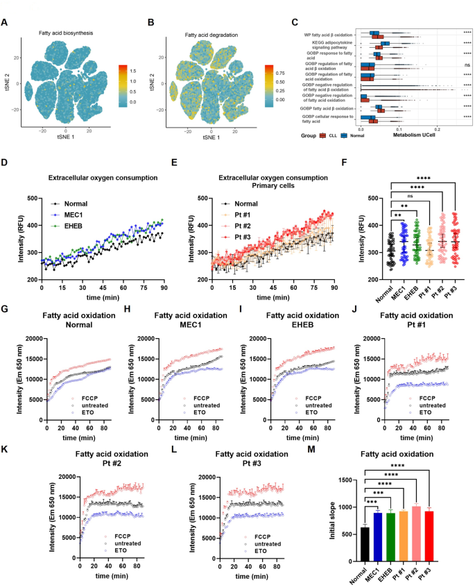 实验目的:验证CLL细胞中脂肪酸氧化(FAO)通路的活性,探索FAO抑制对CLL细胞存活和基因表达的影响。