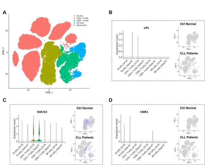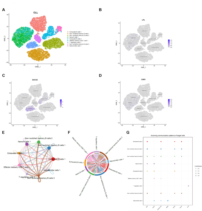 结果解读:单细胞水平分析显示,LPL在CLL患者的B细胞中表达水平显著高于健康对照的CD4+T细胞,SOCS3在CLL患者的CD4+T细胞中表达量低于健康对照,CNR1在CLL患者的B细胞和CD8+T细胞中呈低表达;细胞通讯分析表明,耗竭B细胞、调节性T细胞(Tregs)、未转换记忆B细胞在CLL免疫微环境中发挥广泛调控作用,SOCS3高度富集于Treg群体;高FAM-score患者的免疫浸润模式呈现活化CD4+T细胞、CD8+T细胞、γδT细胞、树突状细胞减少,M2巨噬细胞、浆细胞、滤泡辅助T细胞、活化NK细胞增加的特征,提示脂肪酸代谢重编程塑造了免疫抑制微环境。