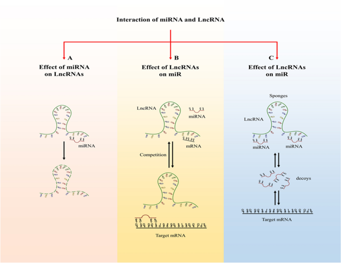 方法细节:整合RNA测序(RNA-seq)、RIP、荧光素酶报告基因等技术的研究成果,总结miRNA与长链非编码RNA的三类互作模式:miRNA靶向降解长链非编码RNA、长链非编码RNA作为miRNA海绵(ceRNA)调控miRNA靶标、长链非编码RNA调控miRNA的表观遗传修饰。