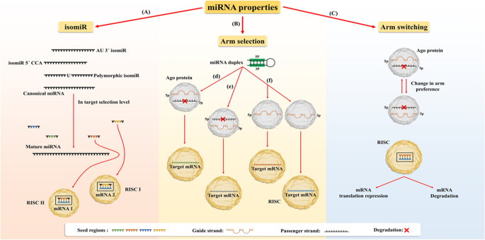 方法细节:整合下一代测序(NGS)、实时荧光定量PCR(qRT-PCR)、荧光素酶报告基因等技术的研究成果,分类总结isomiR、臂选择与臂切换的类型、生成机制及功能差异。