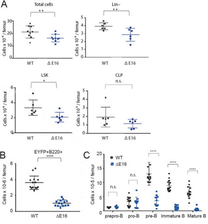结果解读:血常规显示Dido1∆E16小鼠白细胞数量降至WT的33%,淋巴细胞亚群中B220+细胞减少95%(n=14,P<0.0001);流式分析显示骨髓LSK细胞绝对数量显著降低(WT n=9,Dido1∆E16 n=9,P<0.01),B细胞亚群中pre-B与未成熟B细胞数量显著减少(WT n=13,Dido1∆E16 n=11,P<0.0001),提示Dido3缺失导致B细胞发育阻滞在pre-B阶段。