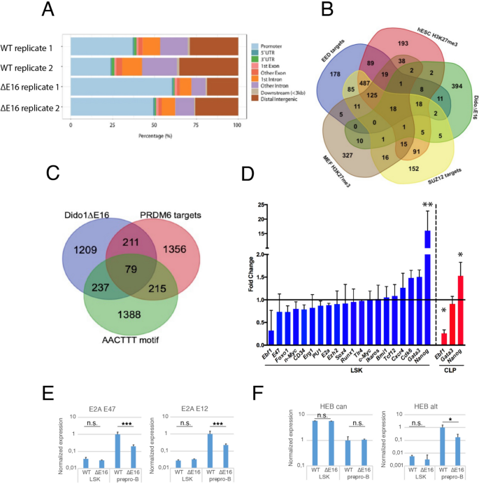 结果解读:qRT-PCR验证显示Dido1∆E16小鼠LSK细胞中Nanog表达上调16倍(n=4,P<0.01),Ebf1表达显著降低,Tcf12的HEBalt亚型在prepro-B细胞中仅为WT的10%(n=4,P<0.001),提示Dido3通过调控Nanog-Ebf1轴及HEBalt亚型的表达,影响B细胞的命运决定与发育进程。