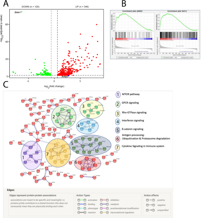 方法细节:分选WT与Dido1∆E16小鼠的骨髓LSK细胞与pre-B细胞,分别进行转座酶可及性染色质测序(ATAC-seq)、转录组测序(RNA-seq)、染色质免疫沉淀测序(ChIP-seq)检测H3K27me3修饰,通过生物信息学分析差异可及区域、差异表达基因与组蛋白修饰变化,结合GSEA、STRING、Metascape等工具进行功能富集与网络分析。
