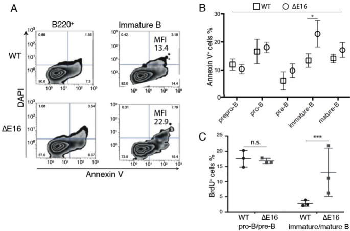 结果解读:Annexin V染色显示Dido1∆E16小鼠未成熟B细胞的凋亡率显著升高(n=3,P<0.05),Annexin V平均荧光强度从WT的13.41升至22.9;BrdU掺入实验显示未成熟B细胞的S期比例升高,但增殖能力无显著差异,提示未成熟B细胞存在S期阻滞并最终凋亡;体外培养中Dido1∆E16小鼠的lin-细胞无法形成CFU-pre-B集落,进一步证实B细胞前体的分化能力缺陷。