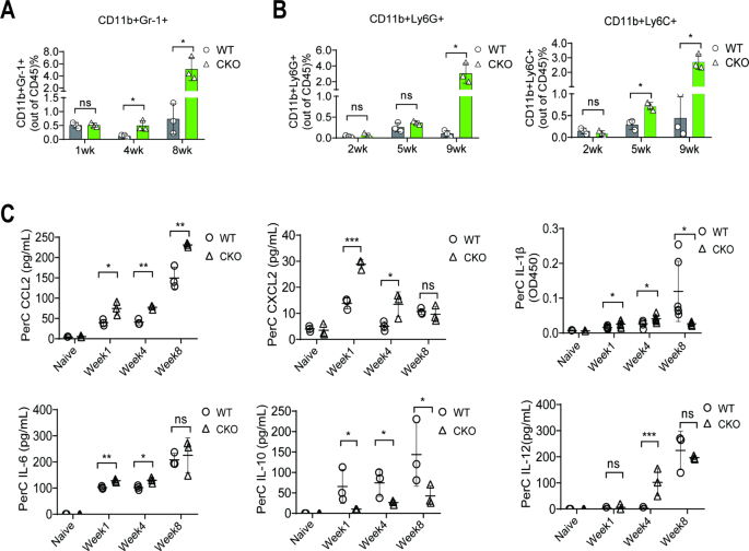 实验目的:解析髓系METTL3缺失对腹腔免疫细胞组分及细胞因子分泌的影响。方法细节:通过流式细胞术分析WT和Mettl3-cKO小鼠腹腔中小巨噬细胞(SPM)、大巨噬细胞(LPM)、M1/M2型巨噬细胞、T细胞及髓源性抑制细胞的比例变化;采用ELISA检测腹腔灌洗液中趋化因子及细胞因子的分泌水平。结果解读:Mettl3-cKO小鼠中SPM的积累速度慢于WT小鼠,但M1/M2型巨噬细胞的极化趋势无显著差异;CD4+和CD8+T细胞的比例在两组小鼠中无显著变化;Gr-1+髓源性抑制细胞在肿瘤进展晚期(8-9周)显著增加约2.1倍(n=6,P<0.01);Mettl3-cKO小鼠腹腔灌洗液中趋化因子CCL2和CXCL2的分泌水平分别为WT小鼠的2.1倍和1.8倍(n=6,P<0.01;n=6,P<0.05),白细胞介素-1β(IL-1β)水平在4周时显著升高,8周时则显著降低。
