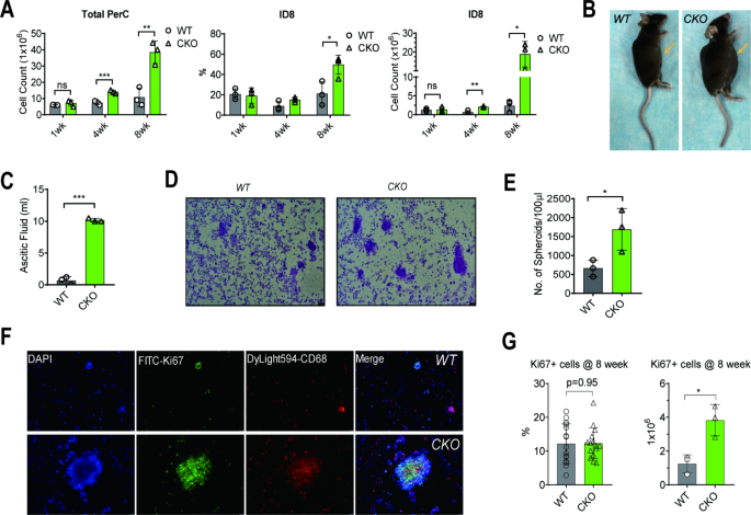 实验目的:探究髓系细胞中METTL3缺失是否影响体内卵巢癌的生长与进展。方法细节:将5×10^5个ID8细胞腹腔注射到WT和Mettl3-cKO小鼠,分别在1、4、8周处死小鼠,收集腹水和腹腔灌洗液,通过流式细胞术分析ID8细胞(CD45-)的比例与数量,检测腹水体积、肿瘤球形体数量,免疫荧光染色分析Ki-67+肿瘤细胞的比例。结果解读:与WT小鼠相比,Mettl3-cKO小鼠中ID8细胞数量在8周时显著增加约2.2倍(n=6,P<0.001),腹水体积增加约1.8倍(n=6,P<0.001),肿瘤球形体数量增加约1.5倍(n=6,P<0.05);但Ki-67+肿瘤细胞的比例无显著差异(n=6,P>0.05),提示髓系METTL3缺失通过调控免疫微环境而非直接促进肿瘤细胞增殖,加速卵巢癌进展。