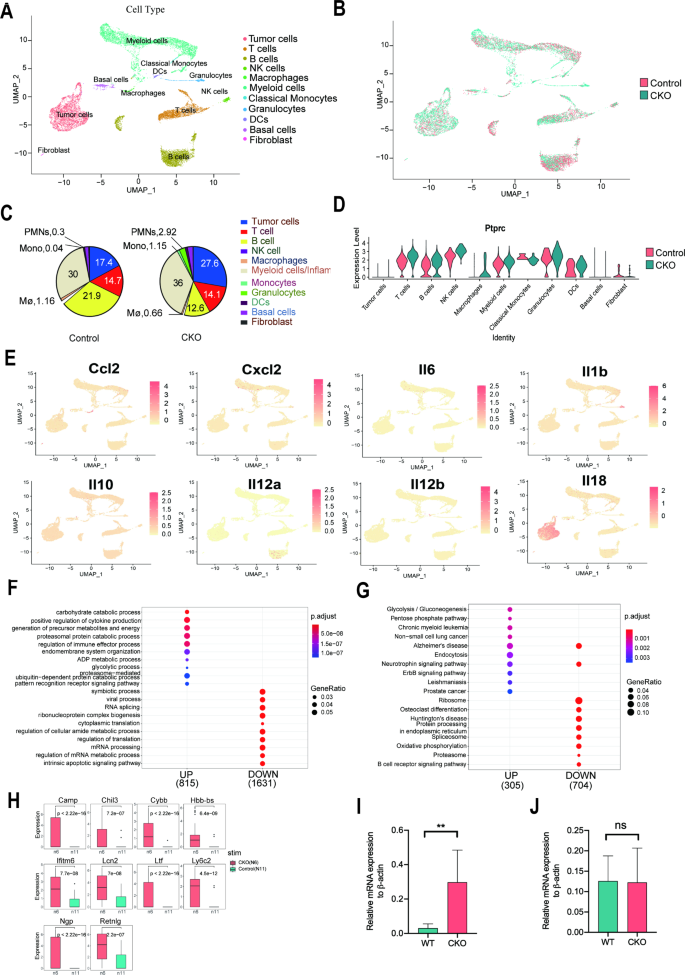 实验目的:通过单细胞RNA测序解析腹腔免疫细胞的组分变化,验证METTL3调控卵巢癌进展的关键分子机制。方法细节:对WT和Mettl3-cKO小鼠的腹腔细胞进行单细胞RNA测序,通过Seurat软件分析细胞簇组成及差异表达基因;采用qRT-PCR验证关键差异基因Cybb的表达水平。结果解读:单细胞测序结果显示,Mettl3-cKO小鼠中卵巢癌细胞的比例显著高于WT小鼠(27.6% vs 17.4%),髓源性抑制细胞的比例显著增加;差异基因分析显示,粒细胞中Cybb基因的表达水平显著上调,qRT-PCR验证其在Mettl3-cKO小鼠粒细胞中的表达水平为WT小鼠的2.5倍(n=3,P<0.01),提示METTL3缺失通过上调Cybb基因表达,增强髓源性抑制细胞的免疫抑制功能,促进卵巢癌进展。