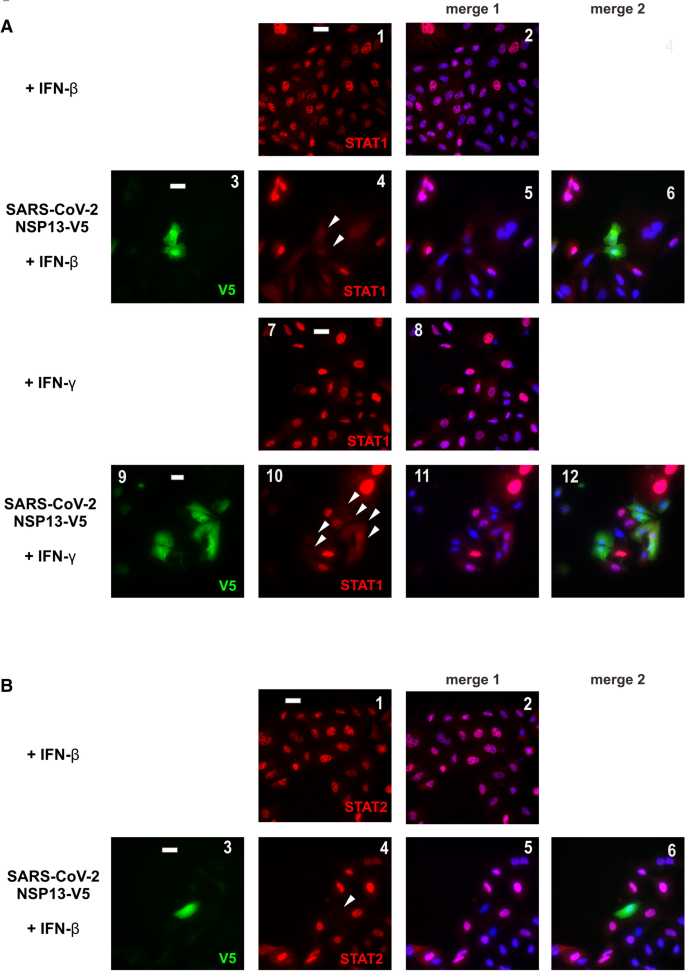 本环节的实验目的是定位NSP13在JAK-STAT通路中的具体作用节点。研究人员在A549细胞中转染带有V5标签的NSP13,用IFN-β或IFN-γ刺激30分钟后,通过免疫荧光染色观察内源性STAT1和STAT2的亚细胞定位;同时在HEK293T细胞中转染NSP13,用IFN-β或IFN-γ刺激10、20、30、45分钟后,通过蛋白质印迹(Western blot)检测JAK1、STAT1、STAT2的磷酸化水平和总蛋白表达量。免疫荧光结果显示,IFN-β刺激可诱导STAT1和STAT2向细胞核转位,IFN-γ刺激仅诱导STAT1核转位,而过表达NSP13可完全阻止上述核转位过程;蛋白质印迹结果显示,NSP13对IFN-β或IFN-γ诱导的JAK1磷酸化无明显影响,但显著抑制STAT1的磷酸化水平,对STAT2的磷酸化无显著作用,说明NSP13的作用靶点是STAT1的磷酸化步骤,而非JAK1的激活。