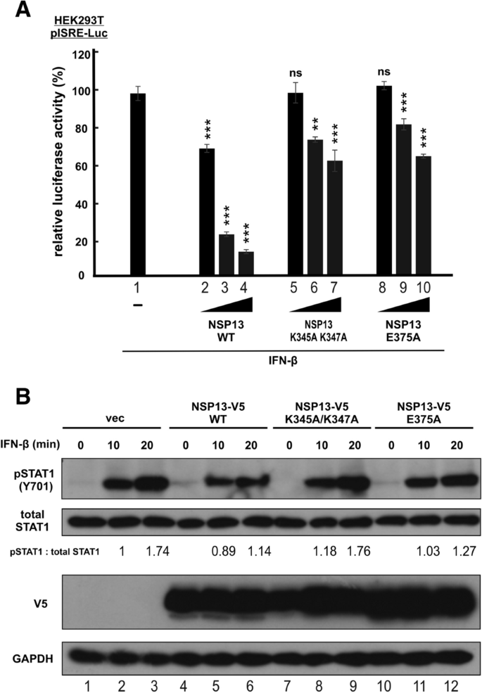 本环节的实验目的是确认NSP13的解旋酶活性在IFN信号抑制中的作用。研究人员构建了NSP13的两个功能缺陷突变体:核酸结合缺陷突变体K345A K347A和NTP酶(解旋酶核心活性)缺陷突变体E375A,在HEK293T细胞中表达这些突变体,通过报告基因实验检测其对IFN-β诱导的ISRE启动子活性的影响,同时通过蛋白质印迹检测其对STAT1磷酸化的抑制作用。报告基因实验显示,与野生型NSP13相比,两个突变体均显著丧失对ISRE启动子活性的抑制能力(n=3,P<0.01或P<0.001);蛋白质印迹结果显示,K345A K347A突变体完全丧失对STAT1磷酸化的抑制作用,E375A突变体仅保留部分抑制能力,说明NSP13的解旋酶活性是其抑制IFN信号通路的必要条件,其核酸结合和NTP酶活性均参与调控STAT1的磷酸化。