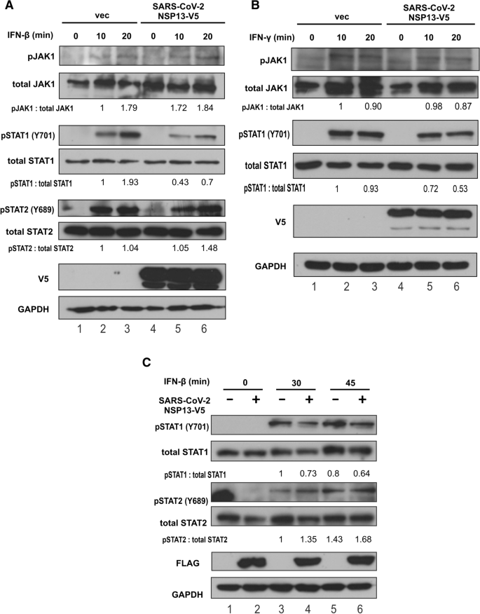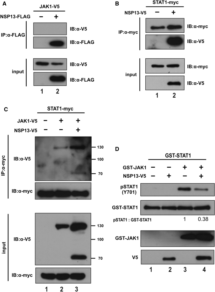 本文未涉及疾病诊断、预后或疗效预测相关的传统生物标志物研究,聚焦于病毒蛋白NSP13作为免疫逃逸关键分子的功能机制解析,其核心发现成果为明确了NSP13是SARS-CoV-2广谱抑制I型和II型IFN信号的核心分子,其作用机制为通过与STAT1直接结合,不影响JAK1-STAT1复合物形成,但特异性抑制JAK1对STAT1的磷酸化,且该功能依赖其解旋酶活性(核酸结合和NTP酶活性)。