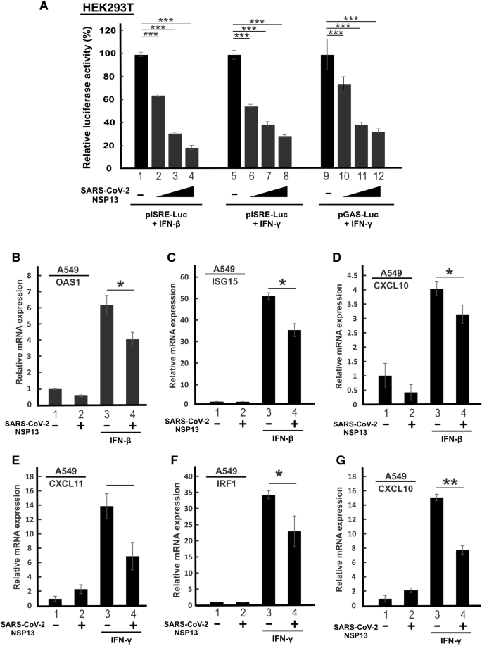 本环节的实验目的是验证NSP13对I型和II型IFN信号通路的广谱抑制作用。研究人员首先在转染效率较高的HEK293T细胞中,将不同剂量的NSP13表达质粒与pISRE-Luc(响应I型IFN)或pGAS-Luc(响应II型IFN)报告基因质粒共转染,用IFN-β或IFN-γ刺激后检测荧光素酶活性;同时在肺腺癌A549细胞(SARS-CoV-2易感细胞系)中过表达NSP13,用IFN-β或IFN-γ刺激后,通过实时荧光定量聚合酶链反应(RT-qPCR)检测ISG15、OAS1、CXCL10、CXCL11、IRF1等ISG的mRNA表达水平。结果显示,NSP13以剂量依赖方式显著抑制IFN-β诱导的ISRE启动子活性,以及IFN-γ诱导的ISRE和GAS启动子活性(n=3,P<0.05或P<0.01或P<0.001);RT-qPCR结果显示,NSP13可显著下调IFN-β诱导的ISG15、OAS1表达,以及IFN-γ诱导的CXCL11、IRF1表达,同时抑制两种IFN诱导的CXCL10表达(n=3,P<0.05或P<0.01或P<0.001),证实NSP13对I型和II型IFN信号均具有抑制作用。