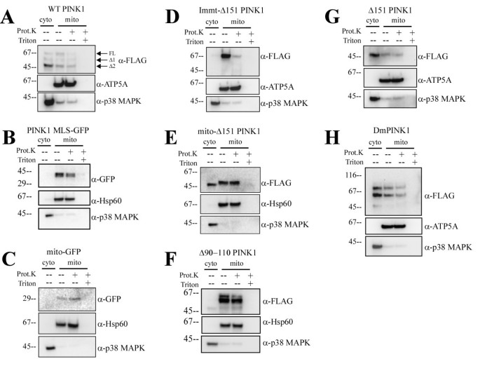 实验目的是明确跨膜结构域(TM)在PINK1膜锚定和胞质朝向拓扑中的调控作用。方法细节:构建PINK1 MLS-GFP(保留跨膜结构域,替换激酶结构域为绿色荧光蛋白,GFP)、Δ90-110 PINK1(缺失跨膜结构域)等突变体,在Hela细胞中表达后进行线粒体分离、蛋白酶K消化实验及免疫荧光染色。结果解读: