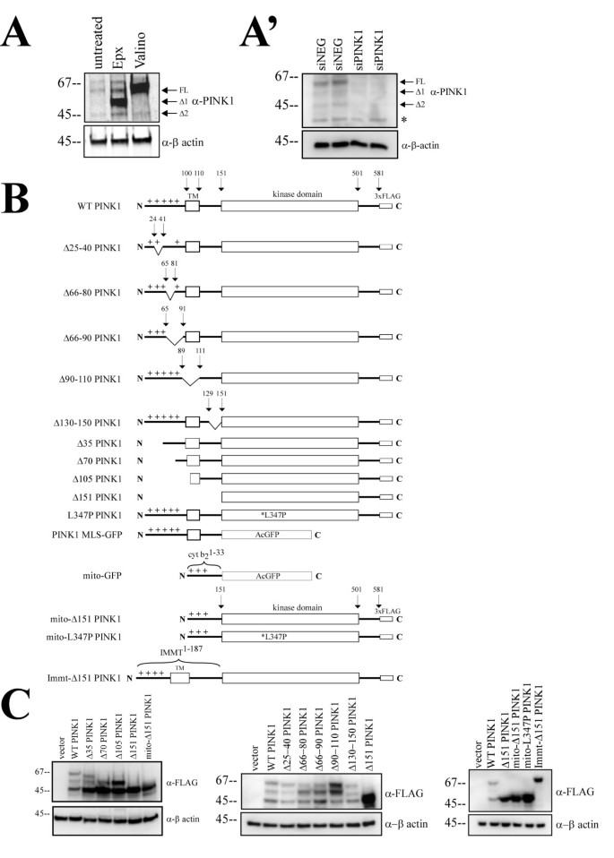 图1A显示,缬氨霉素处理后全长PINK1(FL)水平显著增加,环氧霉素处理后出现约55kDa的Δ1和45kDa的Δ2两种剪切形式;siRNA敲低内源性PINK1后,三条蛋白带均明显减少(图1A"),证实内源性PINK1存在全长、Δ1、Δ2三种稳定形式,且Δ2为功能性剪切产物而非降解产物。产品关联:实验所用关键产品:Novus Biological的抗PINK1抗体(货号BC100-494)、Sigma的FLAG抗体、LI-COR Biosciences的Odyssey红外成像系统。