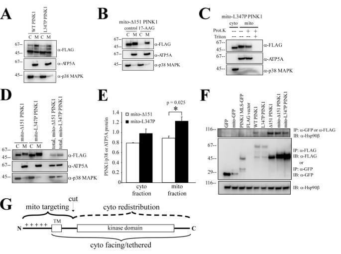图2D和图3显示,Immt-Δ151 PINK1仅定位于线粒体,说明跨膜后的剪切位点是胞质定位的必需条件;mito-Δ151 PINK1均等分布于胞质和线粒体,线粒体部分抵抗蛋白酶K;图4D-E显示,mito-L347P PINK1在线粒体中的比例显著高于mito-Δ151 PINK1(1.226±0.086 vs 0.888±0.044,均值±标准误,n=3,P=0.025),免疫共沉淀实验显示L347P突变显著降低了PINK1与Hsp90的结合(图4F);17-AAG处理后,mito-Δ151 PINK1的胞质分布完全消失,说明Hsp90与激酶结构域的相互作用可阻止PINK1进一步进入线粒体基质,促进其逆向运动至胞质。产品关联:实验所用关键产品:Sigma的p3XFLAG-CMV14载体、Cell Signal Technologies的Hsp90β抗体、Promega的HRP标记二抗。