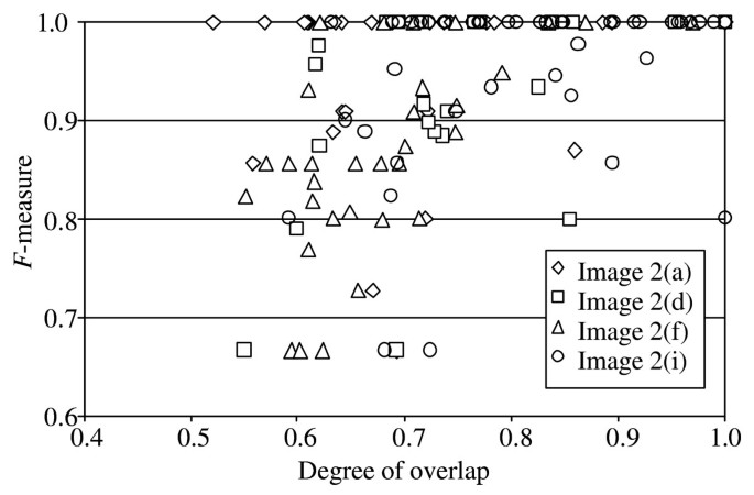 实验目的是实现单个红细胞及重叠红细胞团的准确分割,解决实际样本中细胞重叠的核心问题。方法细节:对单个红细胞进行欧氏距离变换记录峰值,对红细胞团通过迭代检测区域最大值实现分割,采用F值(精确率与召回率的加权调和平均)评估分割性能。结果解读:对于聚焦良好、染色均匀的样本,即使细胞重叠率达50%仍可实现有效分割,9组测试图像的F值普遍超过92%,仅在重度重叠(如Image 2(f))时性能略有下降,证明方法对细胞重叠的鲁棒性优于现有技术。