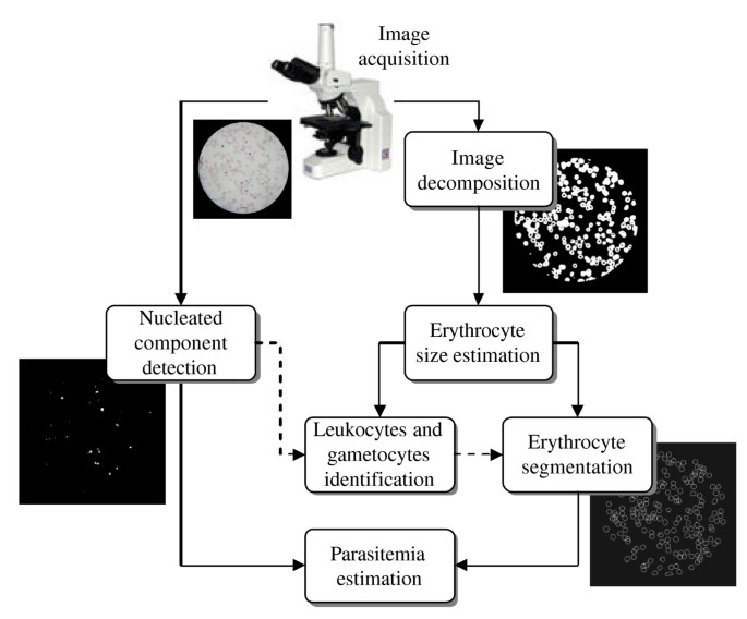 整体研究框架是构建包含六个核心步骤的半自动图像分析流程,从有核成分检测开始,经图像分解、红细胞大小估算、白细胞与配子体识别、红细胞分割,最终实现疟原虫血症的准确估算,形成“样本采集-图像分析-多维度验证”的闭环逻辑,核心科学问题是解决实际样本中非标准情况对自动化检测的干扰,技术路线以“鲁棒性优先”为原则,通过多通道关联分析替代单一模型假设。