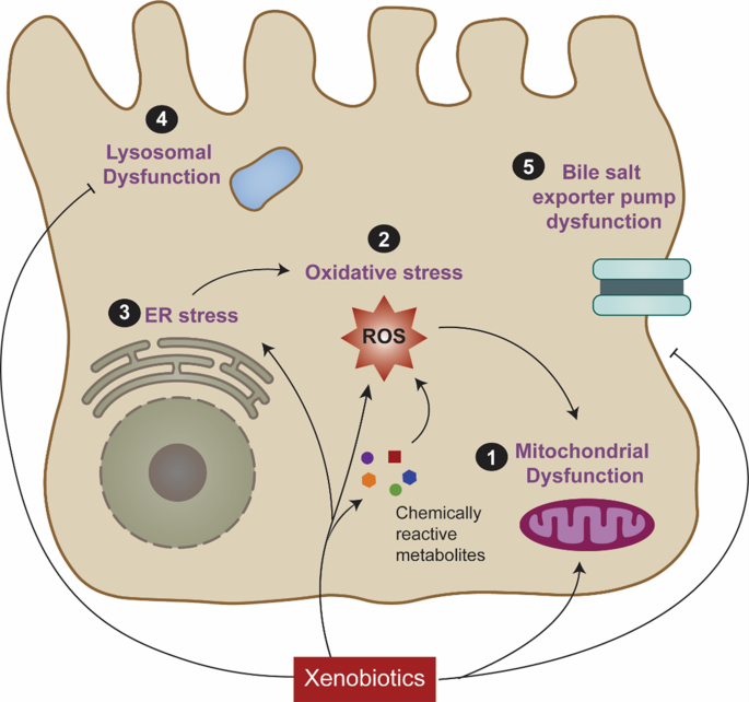 方法细节:作者从线粒体功能障碍、氧化应激、内质网应激、溶酶体功能异常、胆盐输出泵(BSEP)功能异常五个核心方向,梳理了现有研究中各机制的关键分子事件、药物诱导的变化及与肝损伤的因果关联,重点分析了各机制间的交互作用。