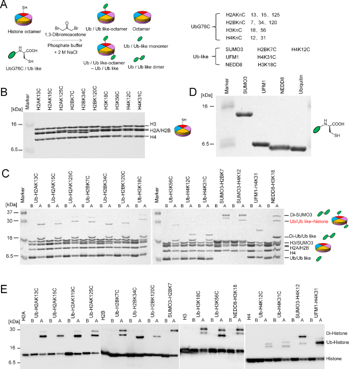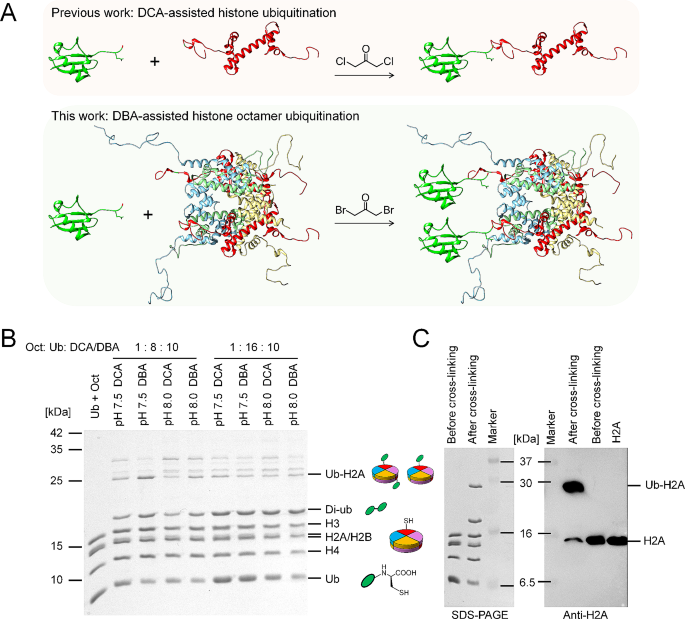 实验目的是建立非变性条件下组蛋白八聚体与泛素的高效交联方法,通过优化反应参数提高交联效率。方法细节上,将组蛋白八聚体(如H2AK119C突变体)与泛素(G76C)按1:8的摩尔比混合,加入10倍摩尔量的DBA,在4℃、pH7.5的条件下反应3小时,随后用50 mM β-巯基乙醇淬灭反应;通过优化反应物摩尔比、pH值、交联试剂类型(DBA与DCA对比)、反应温度等参数,筛选最优反应条件。结果解读显示,SDS-PAGE与免疫印迹(Western blotting)结果证实,最优条件下大部分H2A与泛素成功交联,且DBA的交联效率显著优于DCA;组蛋白H3的内源半胱氨酸(H3C110)因位于核小体内部,无法与DBA接触,无需进行突变,进一步证明了反应的位点特异性。