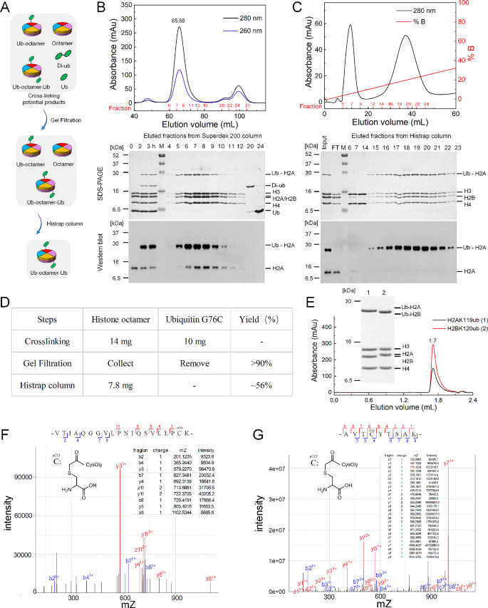 实验目的是获得高纯度的位点特异性泛素化组蛋白八聚体,并验证泛素化修饰的准确性。方法细节上,交联反应产物先通过Superdex 200凝胶过滤层析分离组蛋白八聚体与游离泛素,再利用泛素的N端6×His标签,通过GE Healthcare的HisTrap亲和层析去除未修饰的组蛋白八聚体;采用串联质谱(MS/MS)对泛素化位点进行鉴定,同时通过凝胶过滤层析与SDS-PAGE验证纯化产物的纯度。结果解读显示,纯化后泛素化组蛋白八聚体的整体产率可达56%,远高于传统变性方法的约21%;MS/MS结果证实泛素准确连接在H2AK119或H2BK120位点,凝胶过滤层析与SDS-PAGE结果显示纯化产物均一性高,达到电泳纯水平。