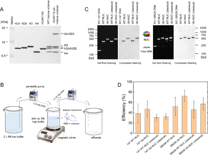 实验目的是验证泛素化组蛋白八聚体能否高效重构为核小体,并对比不同重构方法的效率差异。方法细节上,将泛素化组蛋白八聚体与含Widom 601定位序列的DNA片段(147 bp或两端带38 bp侧翼序列的38N38)按比例混合,通过盐透析法进行核小体重构;通过Native-PAGE分析核小体的均一性,同时计算核小体重构效率(每个实验组设置3-4个平行重复)。结果解读显示,Native-PAGE结果显示重构的泛素化核小体均一性高,与野生型核小体的电泳迁移率相似;重构效率统计显示,NDHOU方法与传统变性方法的重构效率无显著差异(n=4),但NDHOU方法的步骤更为简便,耗时更短,且成功重构了H2BK120ub、H2BK120ub-H3K79M等多种类型的泛素化核小体,证明了方法的通用性。