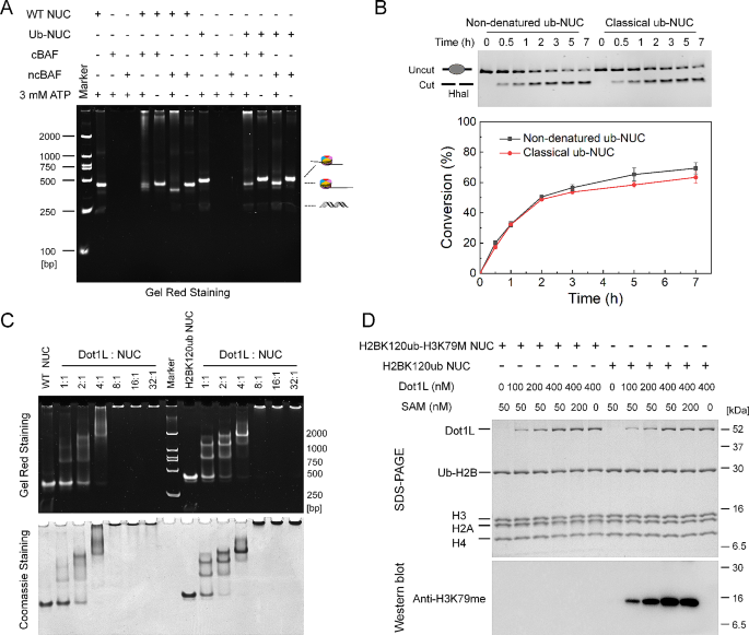 实验目的是验证NDHOU方法制备的泛素化核小体具备生理功能,可作为生化实验的有效底物。方法细节上,开展了四项功能验证实验:一是染色质重塑实验,将泛素化核小体与cBAF或ncBAF复合物在ATP存在下于37℃孵育1小时,通过Native-PAGE检测核小体滑动情况;二是限制性内切酶可及性分析,将NDHOU方法与传统方法制备的泛素化核小体与ncBAF复合物、HhaI内切酶孵育,不同时间点取样后通过Native-PAGE分析酶切效率(n=3);三是电泳迁移率变动分析(Electromobility Shift Assay, EMSA),将不同浓度的Dot1L蛋白与H2BK120ub核小体孵育,通过Native-PAGE检测蛋白-核小体复合物的结合情况;四是组蛋白甲基转移酶(Histone Methyltransferase, HMT)实验,将不同浓度的Dot1L蛋白与H2BK120ub核小体在S-腺苷甲硫氨酸(SAM)存在下孵育,通过免疫印迹检测H3K79的甲基化水平。结果解读显示,染色质重塑实验结果显示,cBAF与ncBAF复合物均可成功将泛素化核小体从DNA中央滑动至末端,与野生型核小体的功能一致;限制性内切酶可及性分析显示,两种方法制备的泛素化核小体的酶切效率无显著差异(n=3);EMSA结果显示H2BK120ub核小体与Dot1L的亲和力显著高于未修饰核小体;HMT实验结果显示,随着Dot1L浓度增加,H2BK120ub核小体的H3K79甲基化水平显著升高,与生理状态下的调控模式一致,证明NDHOU方法制备的泛素化核小体可被染色质调控酶正常识别,具备完整的生理功能。