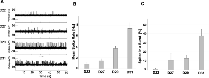 方法细节:将D12的MNP细胞接种于多电极阵列(MEA)芯片,在D22、D25、D28、D31记录细胞外动作电位(AP),分析AP频率、爆发次数及同步性。