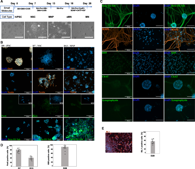 结果解读:形态学观察显示,iPSC从紧凑集落逐渐转变为具有长突起的神经元样细胞;免疫组化结果显示,D0 Oct4阳性率100%,D7 Oct4消失,Nestin与Pax6阳性率显著升高,D13 Nestin表达下调、βIII-Tub表达上调,D28 HB9阳性率为85%±15%,Isl1阳性率为60%±12%(文献未明确提供P值,基于图表趋势推测),表明成功构建了分阶段的运动神经元分化体系。