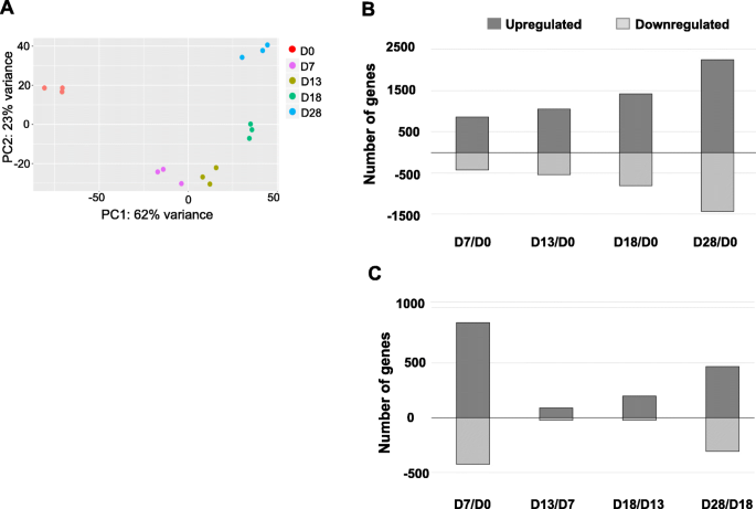 方法细节:在D0、D7、D13、D18、D28五个时间点收集细胞样本,每个时间点设置3个生物学重复;采用Illumina TruSeq Stranded Total RNA试剂盒构建文库,进行RNA-seq测序(每个样本产生2600-4000万条reads);通过FaQCs进行质量控制,PiReT结合DESeq2进行差异表达基因(DEGs)分析(调整后p<0.0002,fold change>3);采用DAVID进行基因本体(GO)分析,LANL开发的OPaver进行KEGG通路分析。