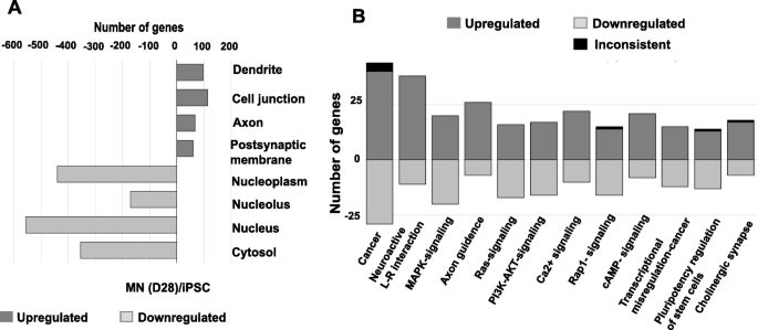 结果解读:主成分分析(PCA)显示各阶段样本聚类紧密,重复性良好;与D0 iPSC相比,D7、D13、D18、D28的DEGs数量逐渐增加,其中D7与D0的DEGs数量最多,表明早期分化阶段基因表达变化最显著;GO分析显示,上调基因主要富集于神经元发育、轴突形成、突触功能等通路,下调基因富集于细胞周期、DNA复制等通路;OPaver分析筛选出12个关键通路,包括MAPK信号、钙信号、神经活性配体-受体相互作用、轴突导向、胆碱能突触等。