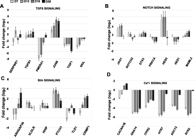 方法细节:针对TGFβ、Shh、Notch、钙信号通路,分析各阶段差异表达基因的变化趋势;采用实时荧光定量PCR(RT-qPCR)验证关键基因的表达水平(n=3,以GAPDH为内参)。