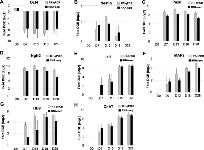 结果解读:RT-qPCR结果与RNA-seq数据高度一致:Oct4在D7显著下调,Nestin在D7上调、D13下调,Isl1、HB9、ChAT在D28显著上调(log2 fold change>2,p<1.5e-6,n=3);免疫组化结果显示,成熟运动神经元中HB9、ChAT蛋白定位正确,表明转录组数据可靠,标记物能有效区分各分化阶段。