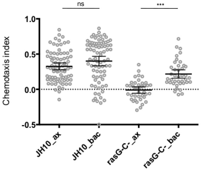 实验目的是验证细胞培养条件是否为导致现有研究结论矛盾的关键变量;方法细节为分别采用无血清培养基(axenic)和细菌共培养体系培养JH10野生型细胞、rasG-/rasC-双敲除细胞,将细胞接种于培养板后,用装载25mM叶酸的微量移液器置于细胞视野内,通过延时显微镜以30秒间隔捕获细胞运动轨迹,利用ImageJ软件的mTrackJ插件追踪细胞运动,计算趋化指数(细胞运动方向与趋化源方向夹角的余弦值);结果解读显示,rasG-/rasC-双敲除细胞在细菌培养条件下的平均趋化指数较无血清培养条件显著升高,平均差异为0.227(n=40,95% CI [0.092, 0.362],P<0.0001),但仍显著低于同期培养的野生型细胞,平均差异为-0.183(n=80,95% CI [-0.066, -0.3],P<0.001);而无血清培养的敲除细胞趋化指数几乎为0,与野生型细胞的平均差异为-0.336(n=80,95% CI [-0.219, -0.452],P<0.00001),说明RasG是盘基网柄菌最优叶酸趋化性所必需的,且培养条件会影响其功能需求。
