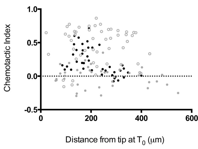 实验目的是验证趋化因子梯度强度是否影响RasG在趋化调控中的作用;方法细节为控制细胞接种密度,分析不同初始距离(与叶酸微量移液器的距离)下细胞的趋化指数,其中近距离对应强趋化梯度,远距离对应弱趋化梯度;结果解读显示,细菌培养的rasG-/rasC-细胞在初始距离小于200μm时,平均趋化指数为0.33(n=40),表现出正向趋化性;而初始距离大于200μm时,平均趋化指数降至0.08(n=40),趋化性可忽略;野生型细胞在所有距离下趋化指数保持稳定,无血清培养的敲除细胞在所有距离下均无明显趋化性,说明RasG在弱趋化梯度下对最优趋化性至关重要,而强梯度下细菌培养细胞对RasG的需求显著降低。