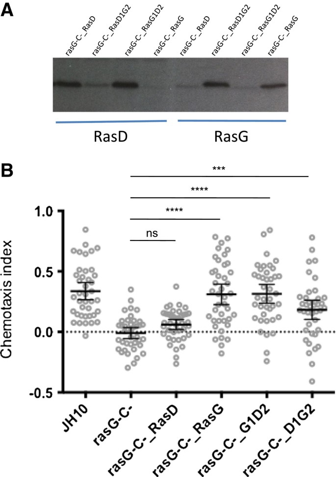 实验目的是确定RasG分子中参与叶酸趋化调控的关键结构域;方法细节为通过PCR技术构建RasG与RasD的嵌合蛋白:RasD1G2(RasD N端104个氨基酸+RasG C端86个氨基酸)和RasG1D2(RasG N端104个氨基酸+RasD C端84个氨基酸),将嵌合蛋白表达载体转染至rasG-/rasC-细胞中,通过免疫印迹验证蛋白表达水平后,检测细胞的叶酸趋化性;结果解读显示,外源性表达RasG可完全恢复敲除细胞的趋化性,而表达RasD无明显作用;表达RasG1D2的敲除细胞趋化指数与野生型无显著差异,平均差异为0.023(n=40,95% CI [-0.105, 0.151],P>0.05),可完全恢复趋化性;表达RasD1G2的细胞趋化性仅部分恢复,与野生型存在显著差异(n=40,P<0.05),说明RasG的N端和C端区域均对趋化调控至关重要,且关键功能氨基酸位于经典switch I/II相互作用区域之外。