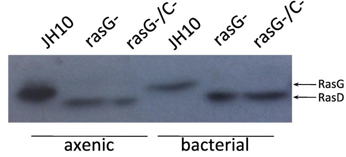 实验目的是明确细菌培养条件下敲除细胞趋化性部分恢复是否由同源RasD蛋白的上调表达介导;方法细节为收集不同培养条件下的细胞,提取总蛋白后进行十二烷基硫酸钠-聚丙烯酰胺凝胶电泳(SDS-PAGE),通过免疫印迹(Western Blot)检测Ras蛋白的表达水平,其中采用泛Ras(Pan-Ras)抗体检测总Ras蛋白,特异性RasG、RasD抗体分别检测对应亚型的表达;结果解读显示,细菌培养的rasG-/rasC-细胞中RasD蛋白表达水平较无血清培养显著升高,但外源性表达RasD无法恢复敲除细胞的趋化缺陷,且未检测到新的Ras亚型表达,说明RasD的上调表达并非细菌培养细胞趋化性改善的原因,排除了同源蛋白代偿的可能。