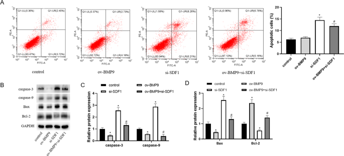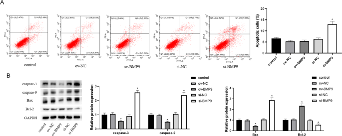 实验目的是明确BMP9对滋养细胞凋亡的影响。方法细节:采用流式细胞术(Annexin V-FITC/PI双染色法)检测细胞凋亡率,收集转染后的细胞,用结合缓冲液重悬后加入染色试剂,室温反应15分钟后上机检测;同时采用Western blot检测凋亡相关蛋白(半胱天冬酶3(caspase-3)、半胱天冬酶9(caspase-9)、Bax、Bcl-2)的表达水平。结果解读:过表达BMP9可显著降低HTR-8/SVneo细胞的凋亡率(n=3,P<0.05),下调caspase-3、caspase-9、Bax的蛋白水平,上调Bcl-2的蛋白水平;敲低BMP9则显著促进细胞凋亡,蛋白表达趋势相反,提示BMP9可抑制滋养细胞凋亡。