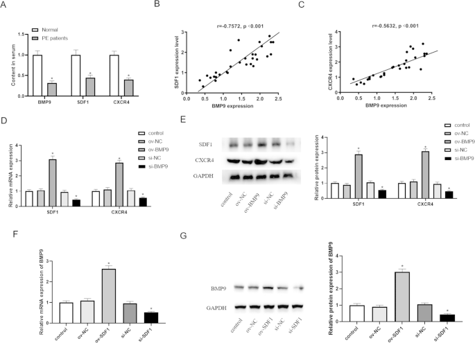 实验目的是明确BMP9与SDF1/CXCR4通路之间的表达调控关系。方法细节:在HTR-8/SVneo细胞中分别过表达或敲低BMP9,采用qRT-PCR和Western blot检测SDF1、CXCR4的mRNA和蛋白表达水平;同时分别过表达或敲低SDF1,检测BMP9的mRNA和蛋白表达水平。结果解读:过表达BMP9可显著上调SDF1、CXCR4的mRNA和蛋白水平(n=3,P<0.05),敲低BMP9则下调其表达;而过表达SDF1也可上调BMP9的表达,敲低SDF1则下调BMP9的表达,表明BMP9与SDF1/CXCR4通路之间存在正反馈调控关系。