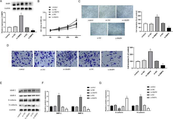 实验目的是明确BMP9对滋养细胞增殖、迁移、侵袭能力的直接调控作用。方法细节:采用细胞计数试剂盒-8(CCK-8)检测细胞增殖活性,分别在细胞接种后0、12、24、48小时检测450nm波长下的吸光度;采用划痕实验检测细胞迁移能力,在细胞生长至90%融合时制作划痕,分别于0和24小时观察划痕愈合情况;采用Transwell侵袭实验检测细胞侵袭能力,在小室上层铺Matrigel基质胶,接种转染后的细胞,24小时后计数穿膜细胞数量;同时采用Western blot检测迁移侵袭相关蛋白(基质金属蛋白酶2(MMP-2)、基质金属蛋白酶9(MMP-9)、E-钙黏蛋白、N-钙黏蛋白)的表达水平。结果解读:过表达BMP9可显著促进HTR-8/SVneo细胞的增殖活性(n=3,P<0.05),增加细胞迁移距离和侵袭率(n=3,P<0.05),并上调MMP-2、MMP-9、N-钙黏蛋白的蛋白水平,下调E-钙黏蛋白的蛋白水平;而敲低BMP9则产生相反的作用效果,提示BMP9可促进滋养细胞的增殖、迁移和侵袭能力。