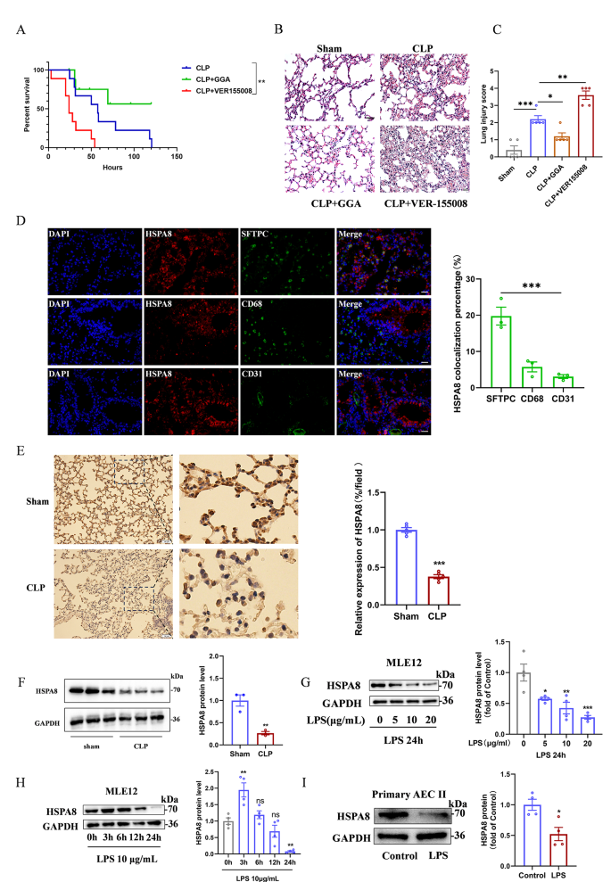 方法细节:构建盲肠结扎穿刺(CLP)小鼠脓毒症模型,将小鼠分为假手术组、CLP组、CLP+HSPA8激动剂香叶基香叶基丙酮(GGA)组、CLP+HSPA8抑制剂VER155008组,通过存活率统计、肺组织病理染色评估疾病严重程度;细胞层面采用脂多糖(LPS)联合三磷酸腺苷(ATP)处理小鼠肺泡上皮细胞(MLE12)及原代Ⅱ型肺泡上皮细胞(AECⅡ),通过免疫组化、免疫荧光、蛋白质免疫印迹(Western blot)检测HSPA8的表达水平。