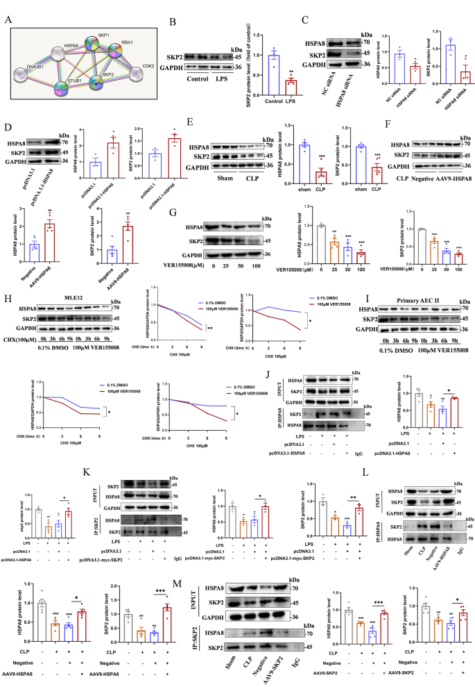 方法细节:通过STRING数据库预测HSPA8与SKP2的相互作用,采用Co-IP验证两者的结合关系;通过siRNA敲低或质粒过表达HSPA8,检测SKP2的蛋白水平与稳定性;过表达SKP2后检测NLRP3泛素化水平及炎症小体激活情况;在动物层面通过AAV9-SKP2验证其对脓毒症诱导ALI的治疗作用。