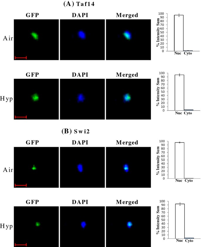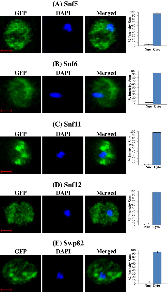 实验目的:定量验证SWI/SNF蛋白在常氧与低氧条件下的亚细胞定位特异性;方法细节:采用Perkin Elmer UltraView ERS转盘共聚焦显微镜,对表达GFP标记SWI/SNF蛋白的酵母细胞进行活细胞成像,采集DAPI(核染色)和GFP通道的Z-stack图像,用Imaris 7.4.0软件定量核与胞质的GFP荧光比例;结果解读:如图5、6、7所示,常氧条件下,Swi3、Snf5、Snf6等6个SWI/SNF蛋白的95%以上定位于细胞核,低氧条件下则95%以上定位于胞质;而Swi2、Taf14等蛋白的核定位比例在常氧与低氧条件下均保持95%以上,提示氧气选择性调控部分SWI/SNF组分的核转运过程;产品关联:实验所用关键产品:Perkin Elmer UltraView ERS转盘共聚焦显微镜、Hamamatsu EMCCD C9100相机、Imaris 7.4.0图像分析软件。
