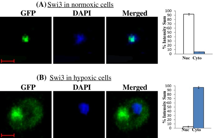 研究过程详述:该Biomarker来源为酿酒酵母细胞,验证方法包括荧光显微镜细胞计数、共聚焦活细胞成像定量、免疫印迹检测蛋白水平、转录组数据关联分析;特异性数据显示,低氧条件下95%以上的Swi3等蛋白定位于胞质,常氧条件下95%以上定位于细胞核;敏感性数据显示,低氧处理6小时内即可完成胞质重定位,复氧1小时内恢复核定位(n≥25,P<0.01,文献未明确具体P值)。