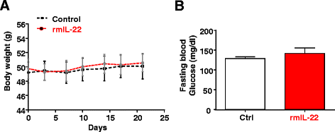 方法细节:高脂饮食饲喂5个月的小鼠,每周两次腹腔注射重组IL-22(20ng/g体重)或生理盐水,持续4周,每周监测体重,实验结束后检测空腹血糖水平。