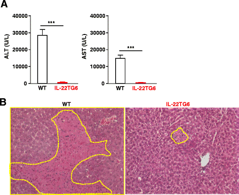 方法细节:构建白蛋白启动子驱动的IL-22转基因(TG6)小鼠,其循环IL-22浓度约600pg/ml,与WT同窝对照小鼠分别饲喂CD或HFD8周,监测体重、体脂率,进行GTT和ITT,检测血清ALT、AST及肝甘油三酯水平;同时通过刀豆蛋白A(Con A)诱导肝损伤,检测血清ALT、AST及肝组织病理变化,验证IL-22的生物学活性。
