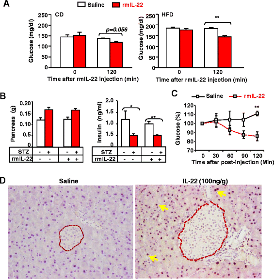 方法细节:高脂饮食饲喂8周的小鼠或链脲佐菌素(STZ)诱导的1型糖尿病小鼠,单次腹腔注射重组IL-22(1000ng/g体重),注射后2小时检测空腹血糖水平,STZ模型小鼠同时检测胰腺重量及血清胰岛素水平;胰腺组织进行免疫组化(IHC)染色,检测磷酸化STAT3(pSTAT3)的表达定位。