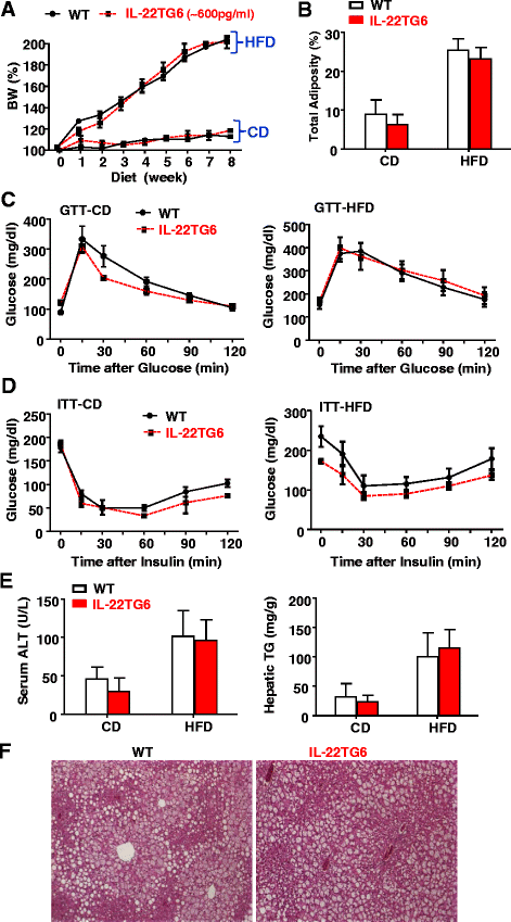 实验目的:明确内源性低水平IL-22是否参与高脂饮食(HFD)诱导的肥胖、胰岛素抵抗及脂肪肝的发生发展。
