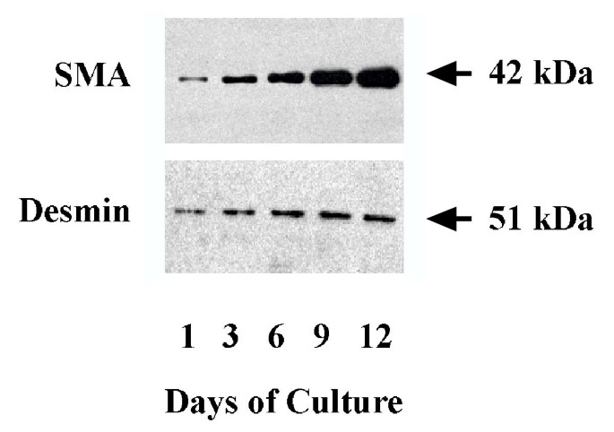 实验目的为获取高纯度的原代大鼠肝星状细胞并验证其活化表型转化过程。方法细节为选取450-550g雄性Sprague-Dawley大鼠,采用胶原酶D、链霉蛋白酶联合灌流法分离肝星状细胞,通过11.3% Nycodenz密度梯度离心纯化,接种于未包被的塑料培养皿,在含10%胎牛血清的DMEM培养基中培养,观察细胞形态变化并检测平滑肌α肌动蛋白和结蛋白的表达。结果解读显示,培养第12天,所有肝星状细胞均呈现肌成纤维细胞表型,平滑肌α肌动蛋白表达随培养时间逐渐升高,第12天达到峰值,结蛋白表达无明显升高,表明细胞已完全活化(图2);培养第3天的细胞仍保留部分脂质滴,平滑肌α肌动蛋白表达较低(图1)。实验所用关键产品:PBL Biomedical Laboratories的大鼠干扰素α、β、γ;Roche Molecular Biochemicals的WST-1细胞增殖试剂、BrdU标记检测试剂盒、平滑肌α肌动蛋白抗体。