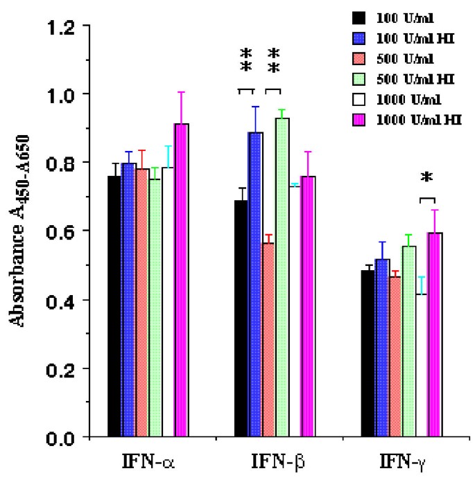 实验目的为对比三种干扰素对大鼠肝星状细胞增殖的影响。方法细节为将传代培养的肝星状细胞接种于96孔板,分别加入500U/ml的干扰素α、β、γ处理1、3、6、9天,采用WST-1细胞增殖实验和BrdU掺入实验检测细胞增殖情况,同时设置热灭活干扰素作为阴性对照,检测不同浓度(100、500、1000U/ml)的剂量效应。结果解读显示,WST-1实验显示,干扰素α对细胞增殖无显著影响(n=8,P>0.05),而干扰素β在处理第6天可使细胞增殖降低32%(n=8,P<0.01),第9天降低18%(n=8,P<0.05);干扰素γ在第9天使细胞增殖降低40%(n=8,P<0.01)(图3A-C)。BrdU掺入实验显示,干扰素β和γ可使掺入率降低约10%(n=8,P<0.01),干扰素α无显著变化(图3D)。剂量效应实验显示,干扰素β的抑制作用无剂量依赖性,仅干扰素γ在1000U/ml浓度下的抑制作用具有统计学意义(n=8,P<0.05)(图4)。