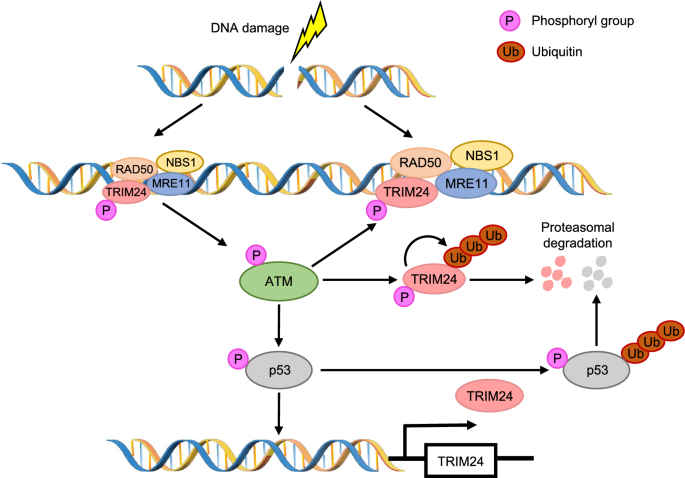 实验目的:明确TRIM24在肿瘤细胞增殖、侵袭转移、DNA损伤修复与化疗耐药中的作用及机制;方法细节:整合细胞周期分析(流式细胞术)、迁移侵袭实验(Transwell小室)、DNA损伤修复实验(激光微辐射、HR/NHEJ效率检测)、化疗耐药实验(药物处理后细胞活力检测)等数据;结果解读:TRIM24通过结合Cyclin D1启动子促进其表达,加速细胞周期G1-S转换,促进肿瘤细胞增殖;通过调控Wnt/β-catenin等通路影响上皮-间质转化(EMT)相关蛋白表达,增强肿瘤细胞迁移侵袭能力;通过招募MRN复合物参与DNA双链断裂的同源重组修复,调控ATM-p53通路,导致肿瘤细胞对化疗药物耐药;产品关联:文献未提及具体实验产品,领域常规使用流式细胞仪、Transwell小室、激光共聚焦显微镜、CCK-8试剂盒等技术开展相关研究。